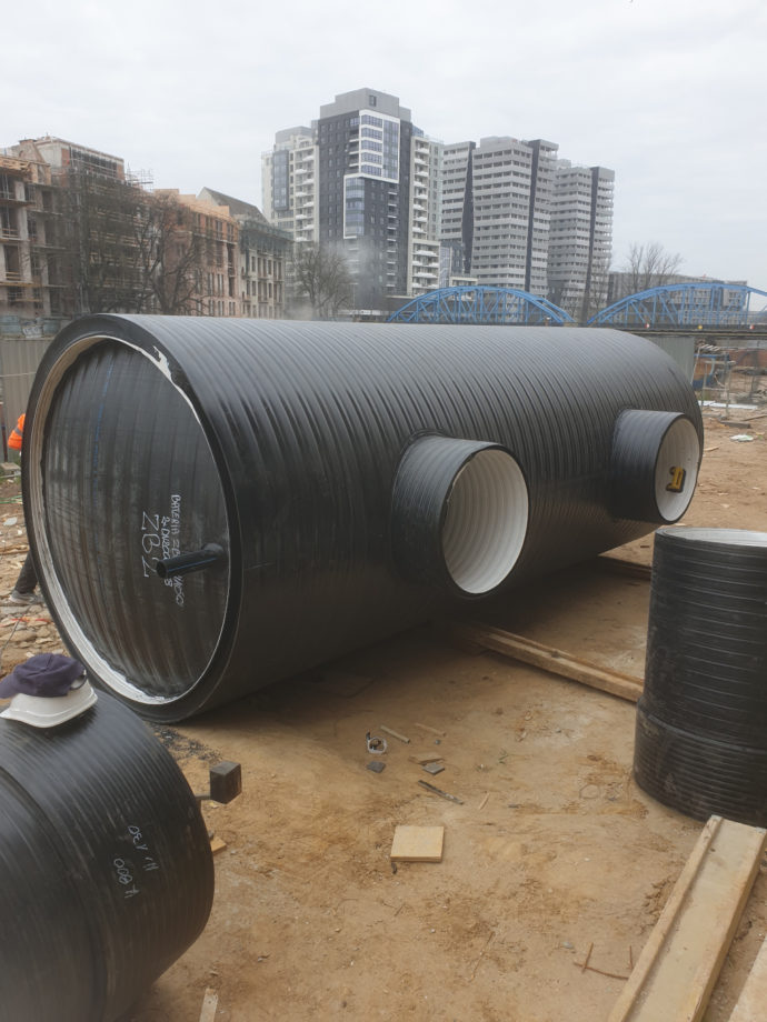 Bateria zbiorników DN2000 SN8 wykonana dla jednej z wiodących firm deweloperskich Dom Development na potrzeby prowadzonej inwestycji przy ul. Księcia Witolda we Wrocławiu.