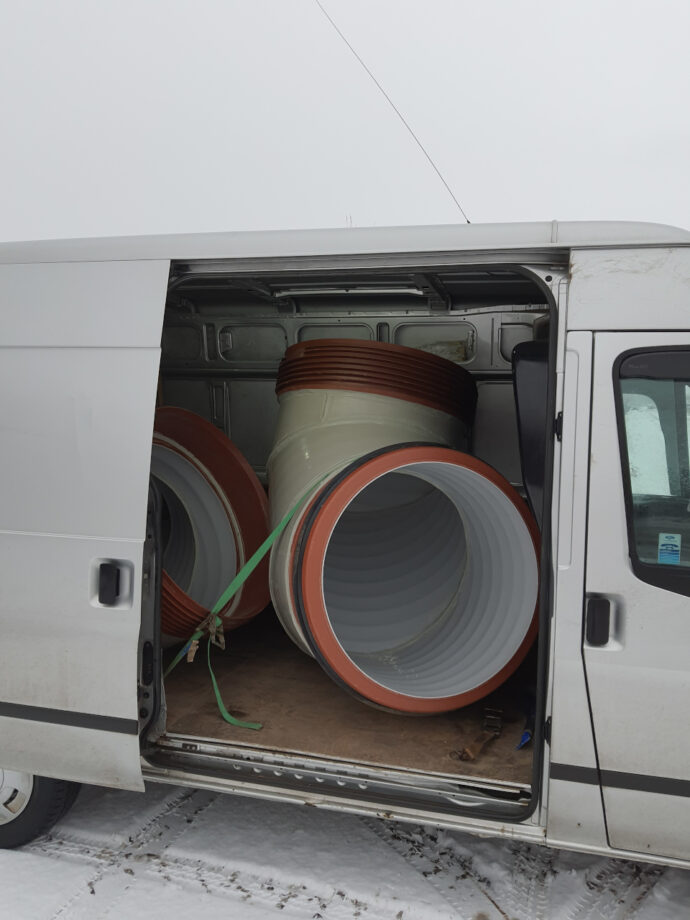 Tak wyglądała dostawa, wyprodukowanych wcześniej przez nas, dwóch kolan Pragma ID DN800 kąt 90 stopni do miejscowości Łozienica koło Szczecina.