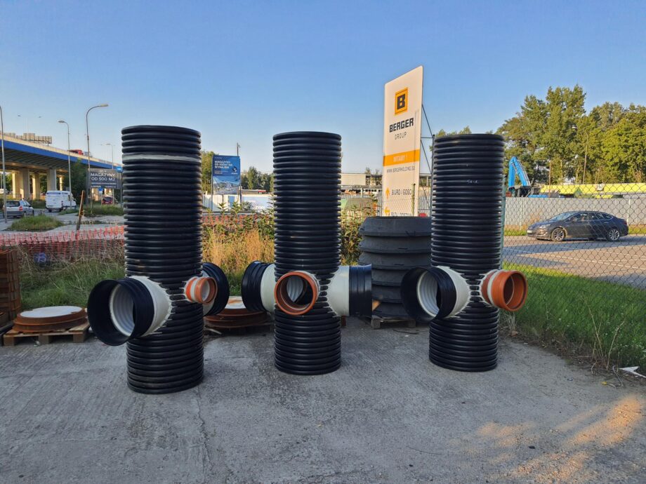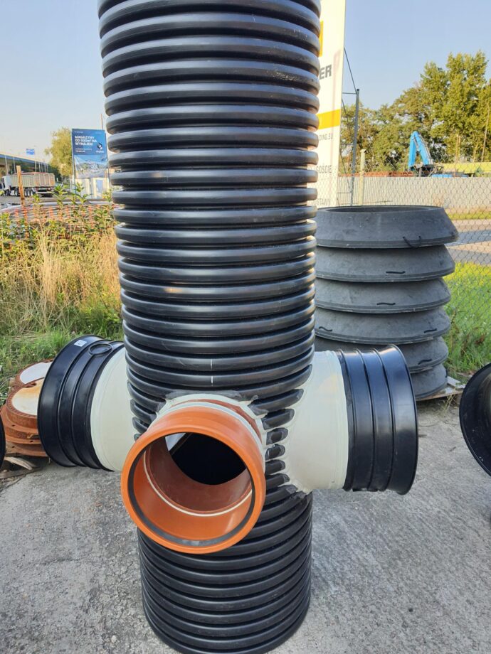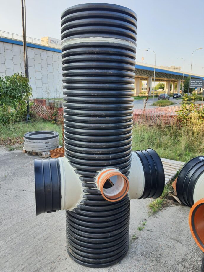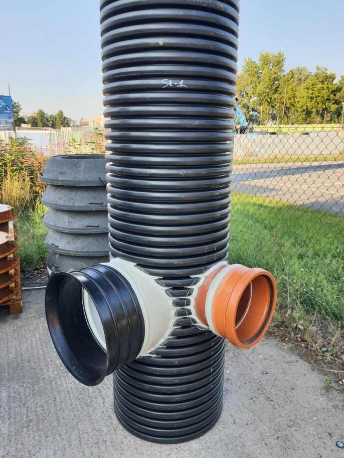 Studnie DN630 osadnikowe z podłączeniem pod rurę produkcji Magnaplast MAGNACOR PP SN8 dwuścienną i rury PVC. Kategorie: RealizacjeStudnie osadnikowe