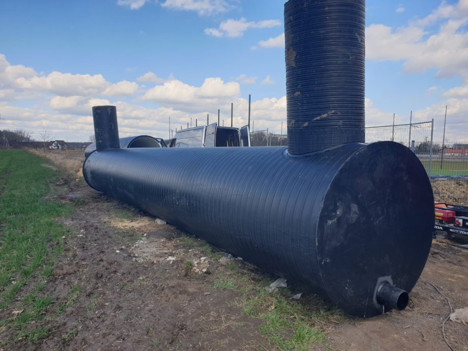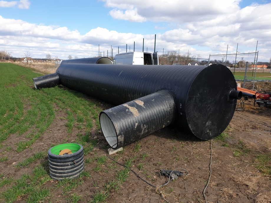 Bateria zbiorników wody deszczowej do podlewania boiska sportowego. Lokalizacja Solec k. Wrocławia.